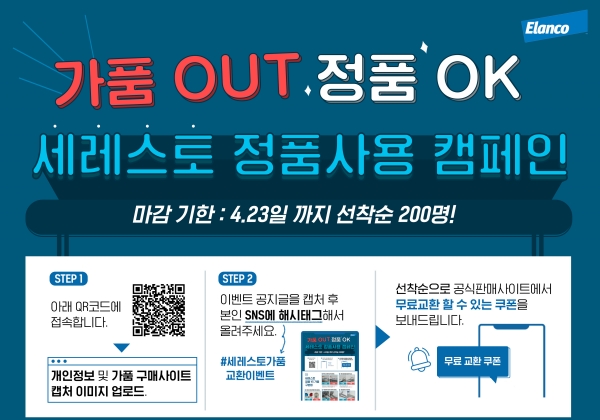 이번 ‘세레스토 정품사용 캠페인’에서는 반려동물 보호자가 구매했던 세레스토 제품이 가품일 경우 정품으로 교환해주는 행사도 진행한다.